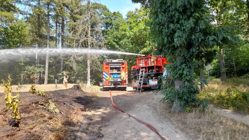 Waterwagen ter plaatse voor een brand in een bos in Baarlo